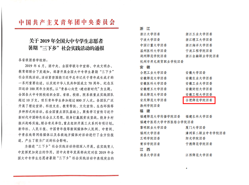 本网讯 近日,共青团中央印发《2019年全国大中专学生志愿者暑期“三下乡”社会实践活动通报》,我院获评2019年全国大中专学生志愿者暑期“三下乡”社会实践活动优秀单位,我院“牵手红领巾”行知学堂教育精准扶贫实践团获评2019年全国大中专学生志愿者暑期“三下乡”社会实践活动优秀团队,我院“皖情皖景皖扶贫”实践团队获评全国农科学子聚力乡村振兴全国大学生暑期社会实践专项行动优秀团队。