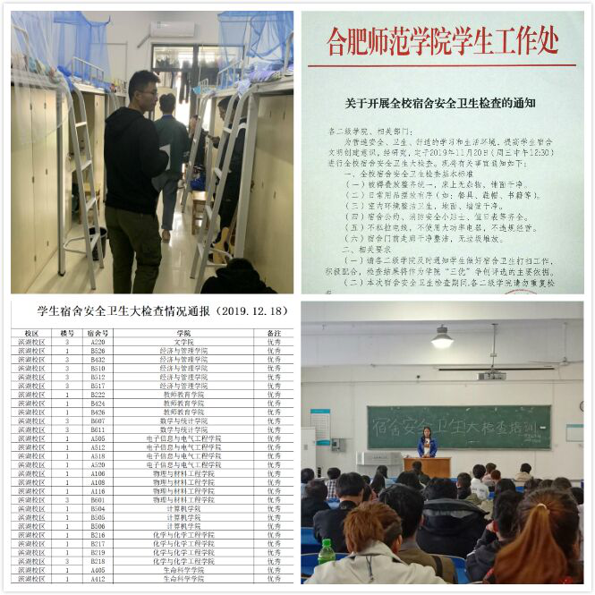 针对学生宿舍卫生情况、宿舍用水用电安全等问题,先后开展了全校宿舍安全卫生大检查7次,通报优秀宿舍426间、不合格和通报批评宿舍66间,综合学年检查结果,评选出63间文明卫生寝室,并予以表彰。