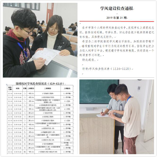 本网讯 近日,我院大学生自律委员会组织开展系列文明校园创建活动,营造良好的学习生活环境。活动围绕学风建设检查、宿舍安全卫生检查与评比、校园文明巡逻等方面展开。2019年先后开展课堂纪律检查322次,上课出勤率检查344次,晚自习督查124次,编发《学风简报》31期,并将检查结果纳入优良学风创建和辅导员工作考核,促进了学生的文明意识和纪律意识。