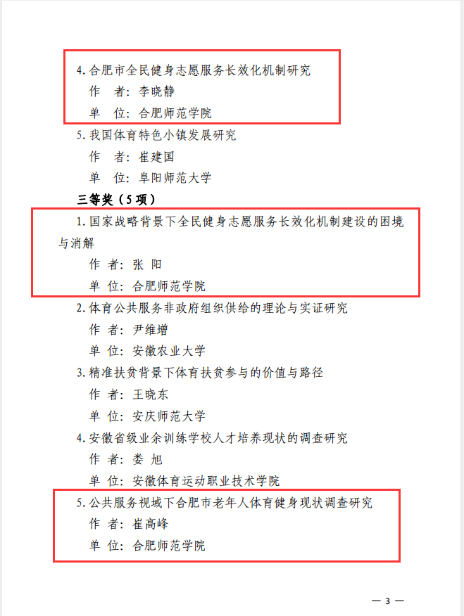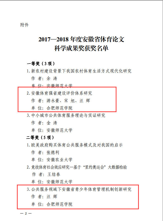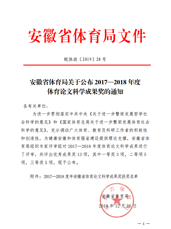 本网讯 12月27日,《安徽省体育局关于公布2017—2018年度体育论文科学成果奖的通知》(皖体政〔2019〕28 号)发布,经专家组评审,共评审出优秀成果奖13项,我校体育科学学院共有5项成果获评优秀成果奖,其中一等奖1项,二等奖2项,三等奖2项。