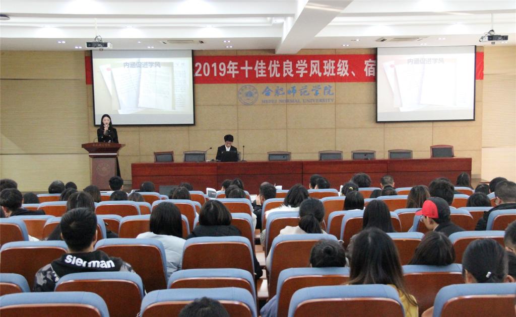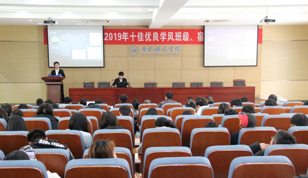 本网讯 12月12日上午,我院2019年十佳“优良学风”班级、宿舍评审会在锦绣校区学术报告厅举行,安徽建筑大学学工部部长徐庚阳、安徽大学学工部副部长汪勤、安庆师范大学物理与电气工程学院党委副书记邹斌、我院学工部部长吴长龙、学生工作部副部长刘艳、团委副书记刁文彬参加汇报会并担任评委,各二级学院党总支副书记、辅导员以及学生代表近300人参加评审会。