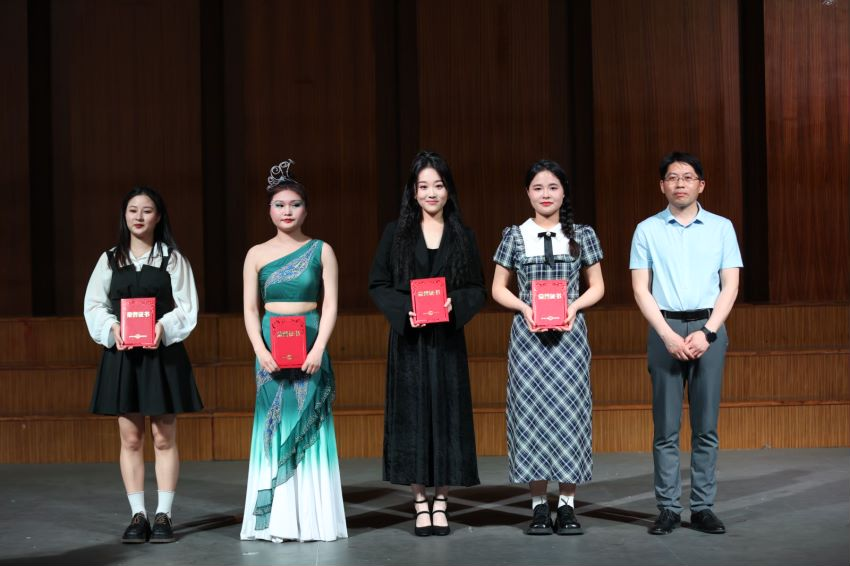 在音乐会的中场环节,音乐学院举行了2023届国家奖学金,省级、校级优秀毕业生颁奖仪式。音乐学院党委书记蔡成梅、院长李劲松、党委副书记宋辉、副院长康勤上台为获奖者颁奖及合影留恋。
