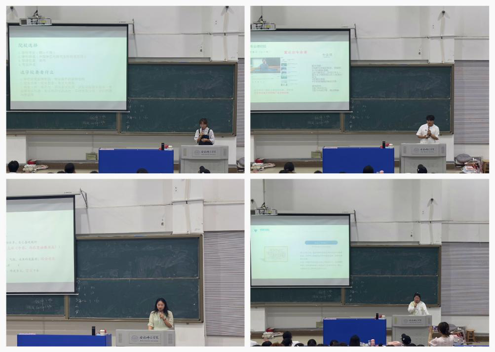 分享会中,孙康龙告诉学弟学妹们应根据自己的实际情况确立目标院校,以及如何去确定合适的目标院校;白涵分享了自己备考的时间规划以及复习专业课的一些方法;田敏力分享了自己在备考阶段用过的“宝贵书籍”,以及在考研过程中如何提高自己的自律意识;张玲玲主要围绕备考过程,备考心态等内容进行详细介绍,她还用自己室友成功上岸的实例向学弟学妹强调了坚持的的重要性。