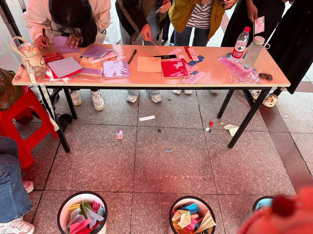 活动现场共设有三个不同颜色的桶和三种不同类型的明信片,参与人员在折纸上写下自己曾经的烦恼或不愉快,叠成纸飞机,自由选择一种颜色的桶丢入,每人共有三次机会,丢入某种颜色即可获得对应寄语的明信片。这也意味着将烦恼扔掉,获得好心情。