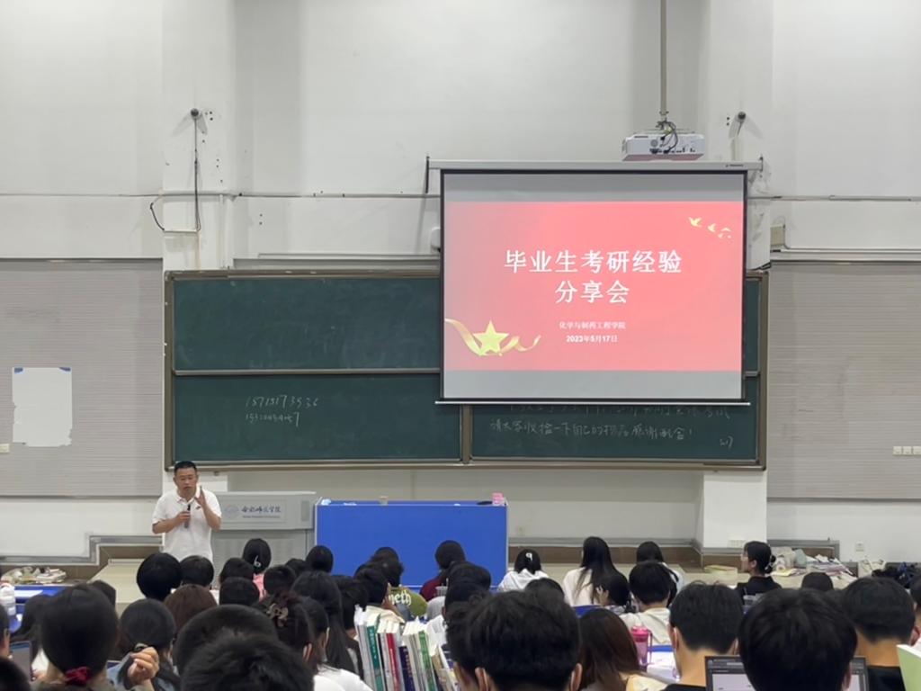 本网讯 为宣扬优秀学生事迹,帮助学生端正心态、树立信心、合理规划未来,形成优良学风,化学与制药工程学院于5月17日晚在锦绣校区逸夫楼西阶1教室举办考研经验分享暨国奖、励志报告会。本次报告会由2020级辅导员汪颖主持,汇报人有学院分团委书记张晖,国家励志奖学金获得者、2020级制药工程2班彭智群,国家奖学金获得者、2020级药物制剂班王喜,2019级制药工程(中外合作)班郭欣悦、及2019级化学工程与工艺班刘筱璇等四位同学。