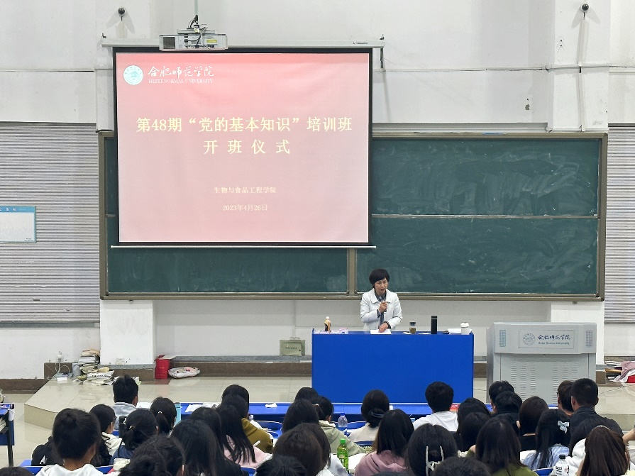 本网讯 为深入学习贯彻党的二十大精神,切实加强对入党积极分子和发展对象的培养、教育和考察,提高思想政治素质,4月26日中午,生物与食品工程学院在逸夫楼西阶2教室举行第48期“党的基本知识”培训班开班仪式。生物与食品工程学院党委书记郭桃芬出席仪式,142名入党积极分子和20名发展对象参加了开班仪式,仪式由党课培训班主任梁悦主持。