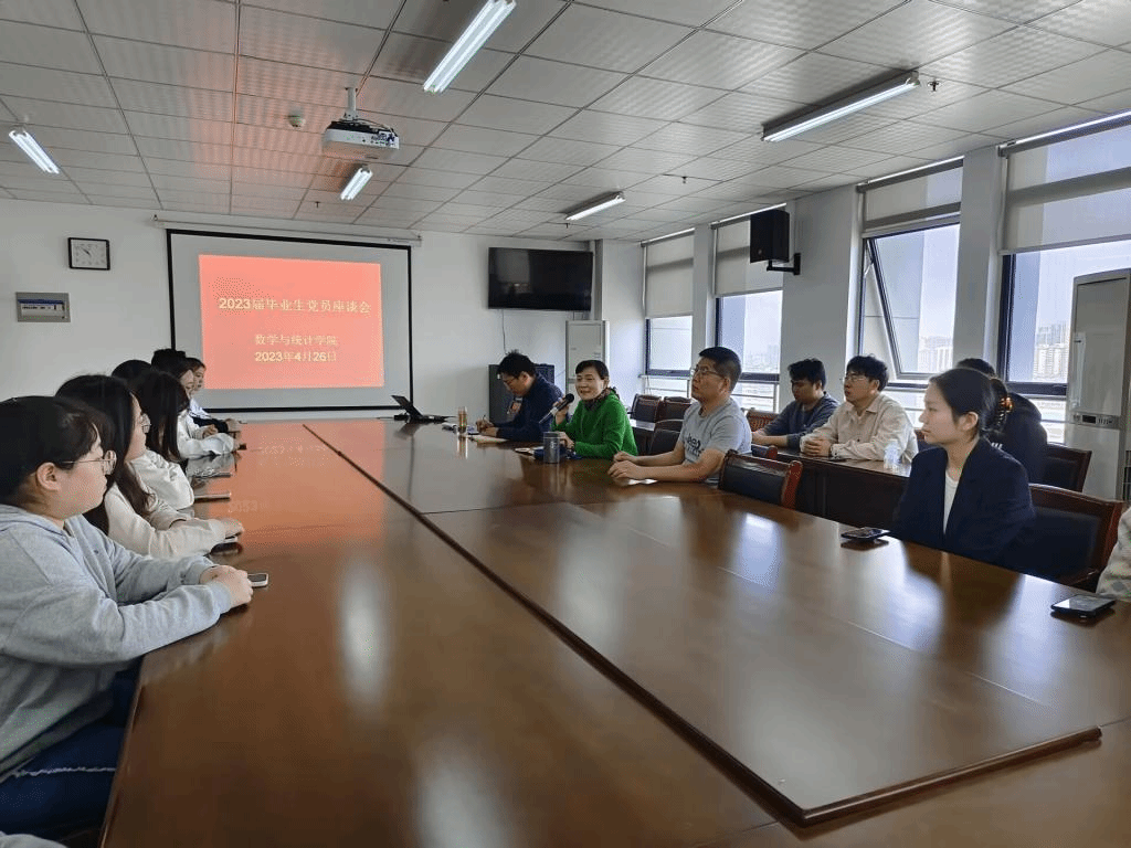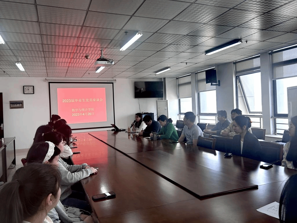 本网讯 为深入开展学习贯彻习近平新时代中国特色社会主义思想主题教育,了解毕业生党员的思想、就业等状况,进一步加强对毕业生党员的教育、管理和服务。4月26日上午,数学与统计学院在行知楼1102会议室召开了毕业生党员座谈会。学院党委书记郑支农、副书记陶金昌、学生党支部书记杨尔飞、毕业班辅导员刘全亚以及毕业生党员参加了座谈会,座谈会由刘全亚主持。