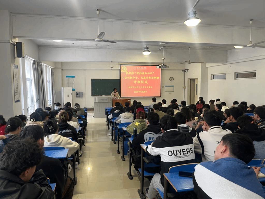 本网讯 4月25日中午,物理与材料工程学院在锦绣、滨湖两个校区同时举行第48期“党的基本知识”入党积极分子、发展对象培训班开班仪式。院党委书记唐洁、党委副书记吴震分别出席开班仪式,辅导员吴梦云、张伶俐、费文清及全体入党积极分子及发展对象147人参加。