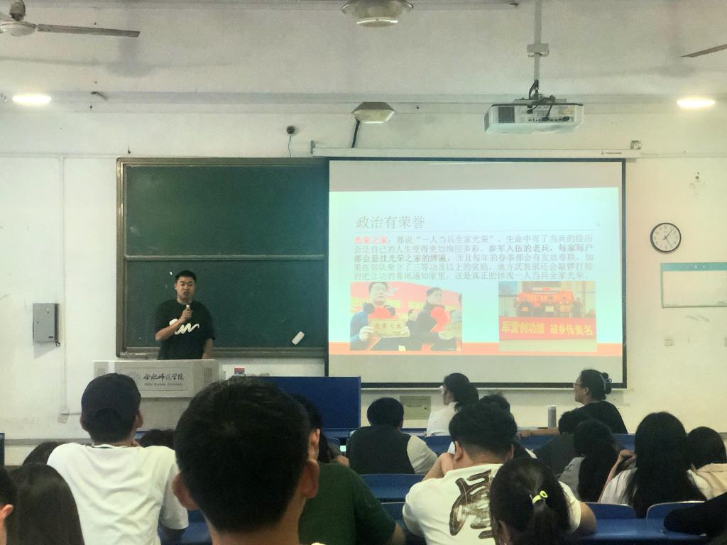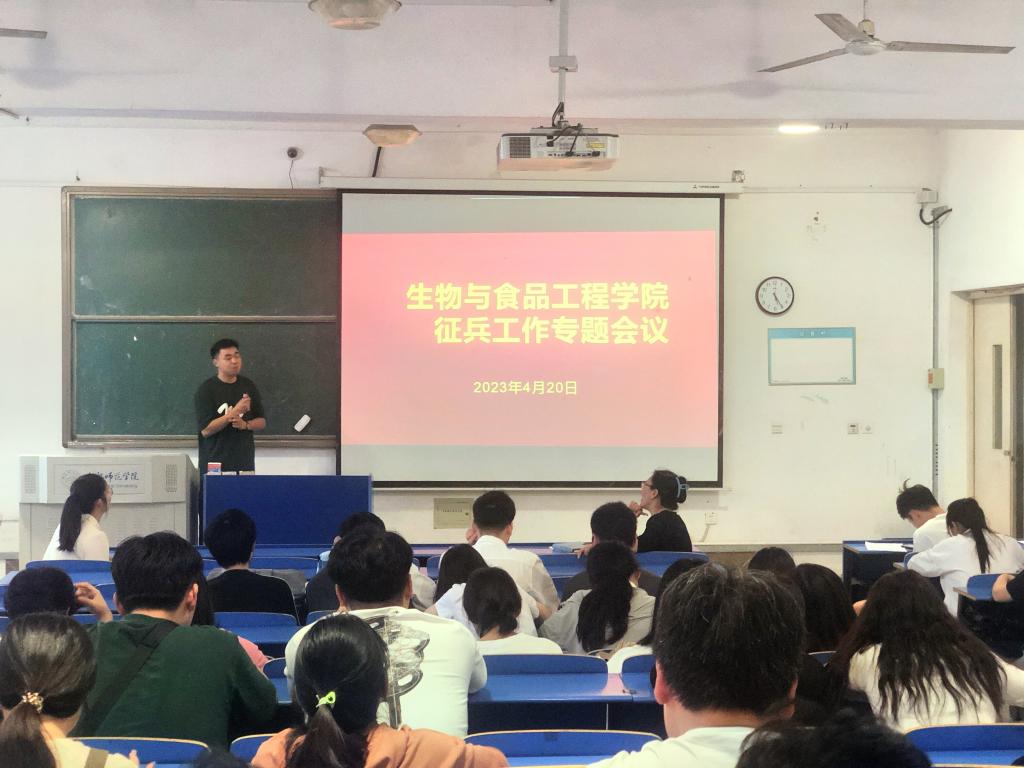 本网讯 为贯彻安徽省大学生征兵工作精神,落实学校2023年征兵工作要求和部署,激发生物与食品工程学院学子参军报国、献身国防热情,学院于4月20日下午在逸夫楼104教室召开征兵工作专题会议,会议由生物与食品工程学院党委书副书记杨娜主持,毕业班辅导员高欢、退役复学学生2019级柳富龙及2023届部分毕业生参加了会议。