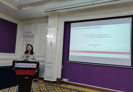 强云在分论坛做了题为“思政之‘道‘融合演讲之‘术‘的混合式教学探索-以《理解当代中国•英语演讲教程为例》” 的发言。她从思政之“道”与演讲之“术”的内涵,思政之“道”与演讲之“术”融合原因,以及思政之“道”与演讲之“术”融合方法三个方面探讨了成果导向、思政育人的混合式教学路径。