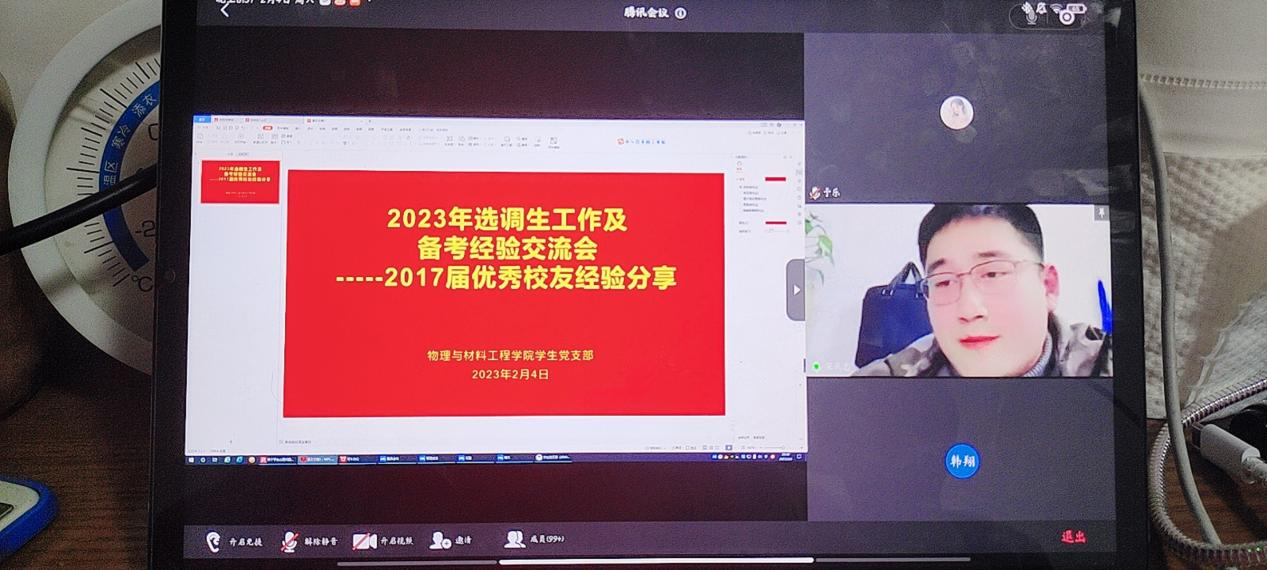 本网讯 为更好推进2023届毕业生就业工作,发挥选调生就业典型的示范作用,促进毕业生更充分高质量就业,2月3日,物材学院通过线上举办选调生报考组织工作会及备考经验分享会。会议邀请了2017届优秀毕业生、选调生宋庆忠做交流分享,全体学生党员、部分入党积极分子参加会议,该学院党委副书记吴震出席会议。会议由学院学生第二党支部书记韩翔主持。