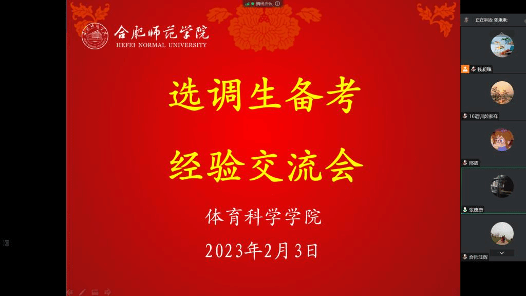 本网讯 2月3日下午,体育科学学院在腾讯会议上举办2023年选调生备考经验交流会,交流会邀请体育科学学院2020年选调生彭家祥作经验交流与分享。体科院教工第一党支部书记汪辉、体科院教工第二党支部书记陈秀、辅导员张康康参会,2019级运动训练专业、体育教育专业毕业生党员参加。交流会由体科院党政秘书、组织员钱昶臻主持。