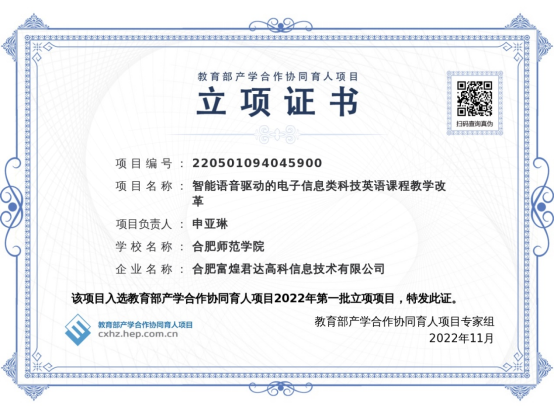 本网讯 11月1日,教育部高等教育司下达了关于公布2022年第一批产学合作协同育人项目立项名单的通知,外国语学院教师申亚琳主持的“智能语音驱动的电子信息类科技英语课程教学改革”项目获批立项。这也是我院首次获得教育部产学合作协同育人的项目。