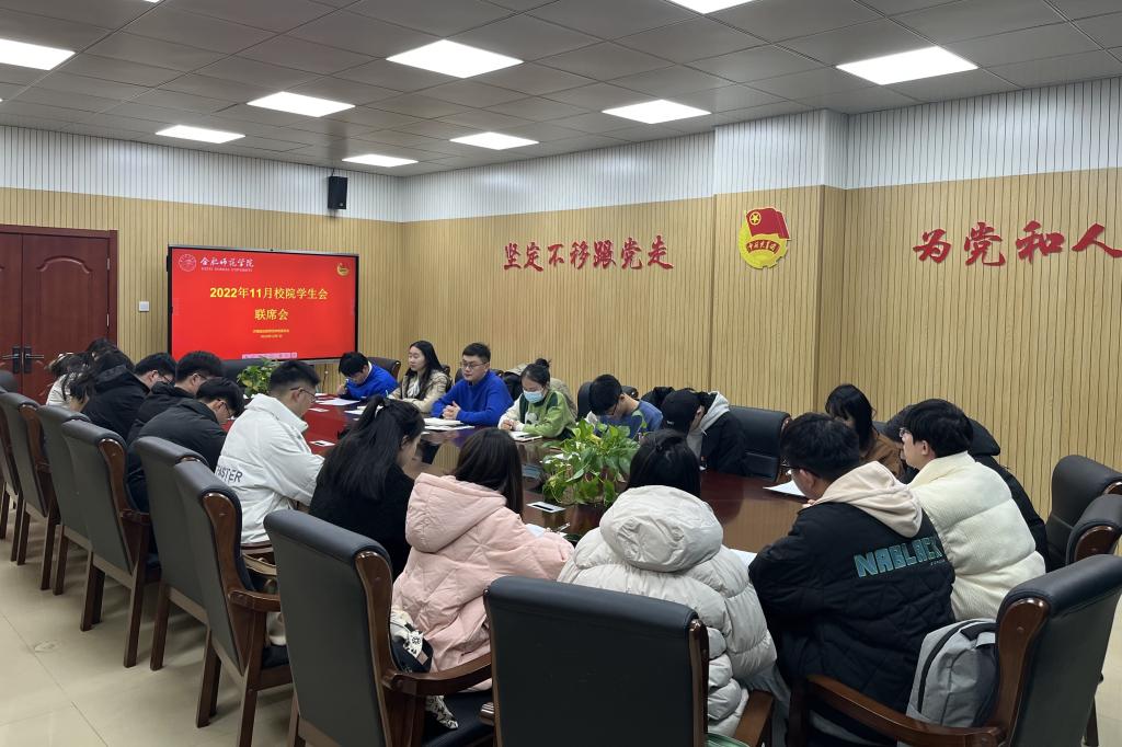 本网讯 12月1日中午,2022年11月校院学生会联席会议在锦绣校区共青之家会议室召开,院团委副书记刁文彬、院团委组织建设部负责人魏晓倩,院学生会和各二级学院学生会负责人员参加本次会议。