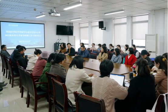 本网讯 为进一步落实立德树人根本任务,促进学生德智体美劳全面发展,11月23日外国语学院“芳华苑”学生成长发展中心在行知楼1002会议室召开2022级本科生学业导师制工作座谈会。外国语学院党委书记马四民、院长李可胜、党委副书记马喆、各专业负责人和2022级全体学业导师、辅导员参加此次座谈会,会议由马喆主持。