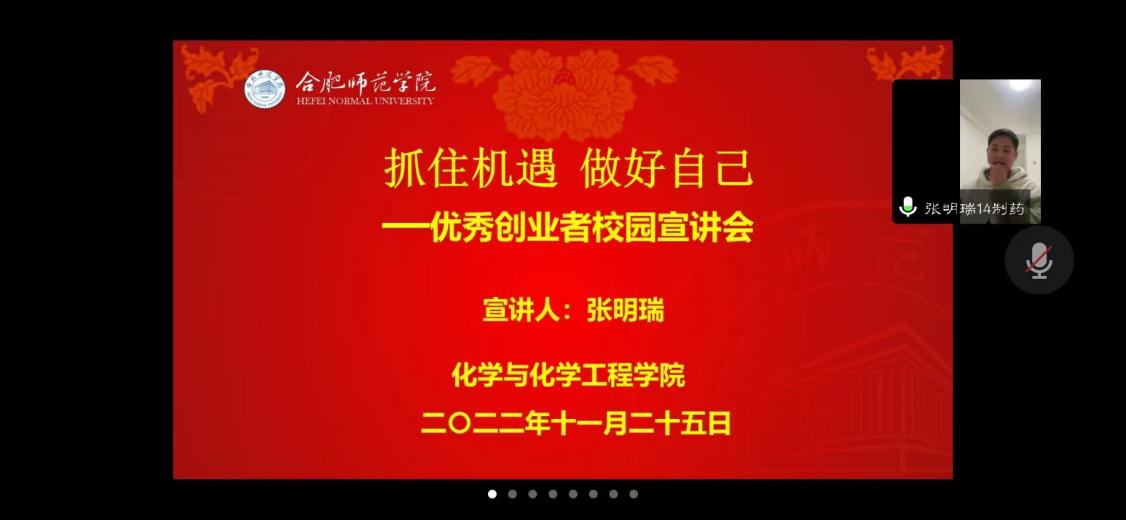 本网讯 为进一步推动2023届毕业生就业创业工作,培养大学生创新创业意识,搭建优秀校友与学生交流的桥梁。11月25日,化学与化学工程学院举办主题为“抓住机遇,做好自己”的优秀创业校友线上宣讲会。会议邀请2014级制药工程专业毕业生张明瑞宣讲。