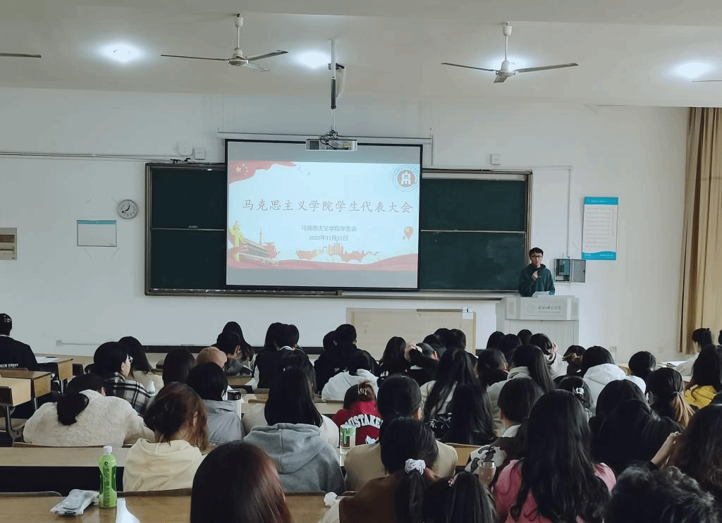 本网讯 11月21日中午,马克思主义学院第二次团代表大会和第二次学生代表大会于锦绣校区博约楼108召开,由2021级思想政治教育班赵璟丽主持。辅导员王萌、各年级学生代表、部分学生会成员出席此次会议。