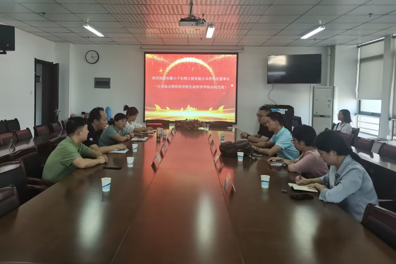 本网讯 9月19日下午,安徽大千生物有限公司董事长芮双印、总经理李燕华、总工程师陆大伟、人事经理边晓红一行赴生命科学学院就校企合作、学生培养等问题展开交流。生命科学学院副院长朱桂兰、生物制药系主任王伟、实践教学部主任张雁以及相关教师代表参加活动。