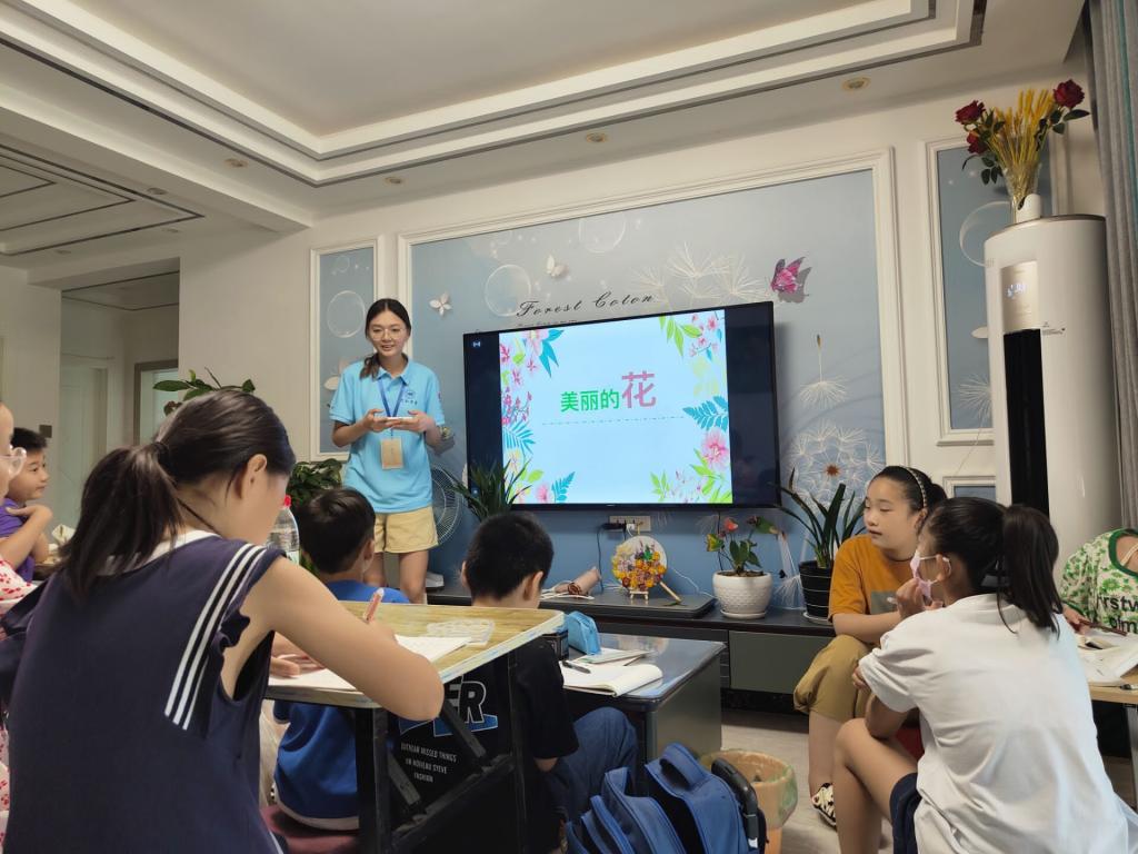 本网讯 7月11日,淮南凤台行知学堂上午的第一节课,小先生付韦为17位小学员带来了科普系列课程——《美丽的花》。