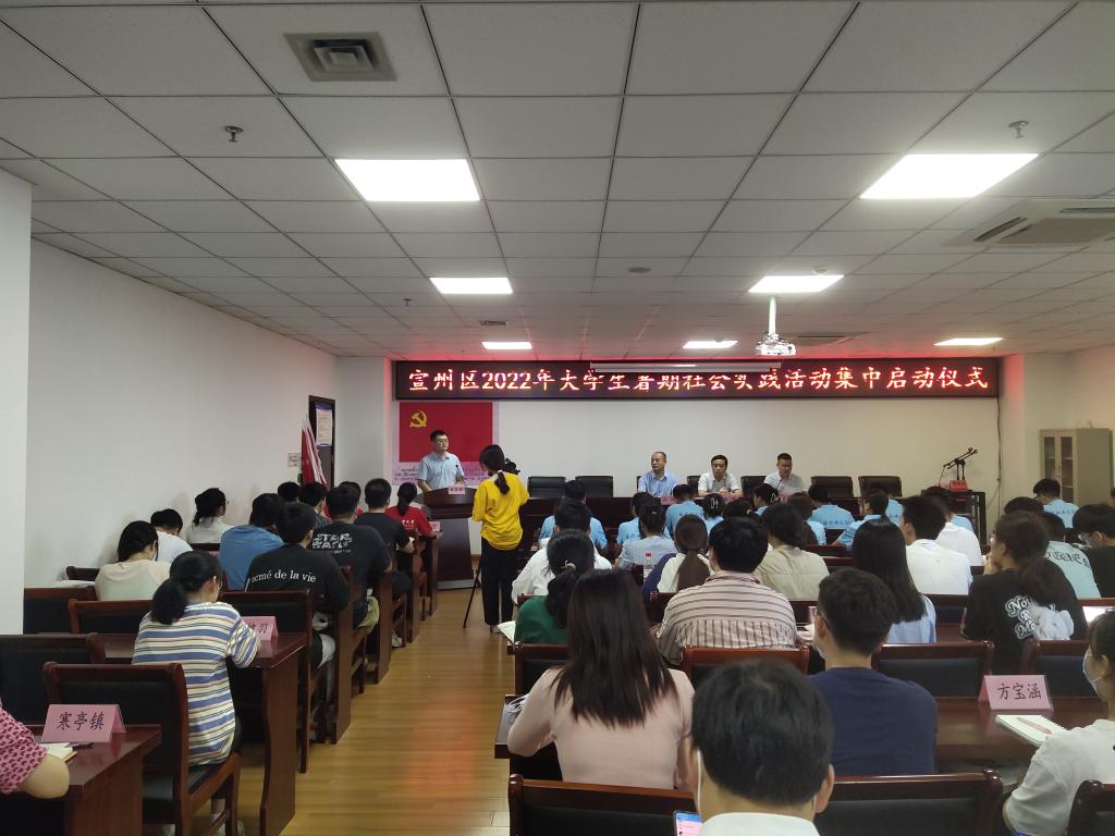 本网讯 7月11日上午,宣州区委区政府举办宣州区2022年大学生暑期社会实践活动集中启动仪式。区委常委、组织部长朱伟,宣州团区委、宣州区人才办等单位负责人,北京大学、合肥工业大学(宣城校区)、皖南医学院、beat365唯一官方网站四所高校暑期社会实践团队的师生参加启动仪式。