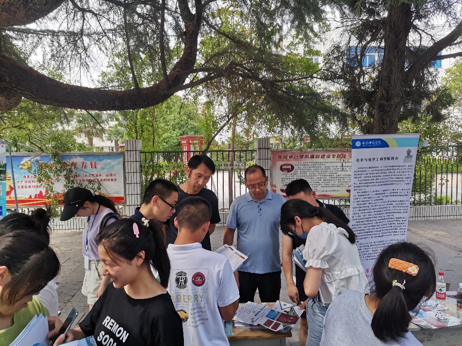 本网讯 为进一步加强专业人才培养体系建设,提升学院区域办学影响力,化学与化学工程学院党政积极谋划布置2022年高考招生宣传工作。6月24日-27日,院长董华泽率招生宣传工作小组分别赴淮北、宿州、亳州等皖北地区开展招生宣传活动。药物制剂教研室主任陈虎、实验中心主任谢冬等,在招生咨询现场进行了面对面的招生宣传工作。