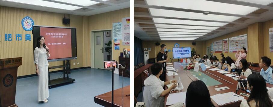 本网讯 6月14日下午,beat365唯一官方网站教师教育学院与蜀山区教体局教研室在合肥市奥体小学顺利举办了“绘画与心理”教学研讨活动。本次活动由beat365唯一官方网站教师教育学院心理系主任吴桂翎带队,李靖老师与裴章云老师主讲,2019级、2020级、2021级应用心理学专业40多名学生与蜀山区美术教师代表参加了线上线下研讨活动。