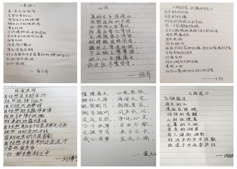 5月22日-5月25日,小组开展了诗歌创作活动。学员们纷纷执笔书写下对美好生命的赞美和留恋。其中,王轩同学在《风铃花,玫瑰和月光》中写道:“白色的风铃花,白色的玫瑰,向往的是纯洁和美丽,在一个寂静的夜晚,它们悄悄的说起了自己的话语。”何乔同学在《心语》中写道:“愿時光走的慢些,我能追赶到末稍。”