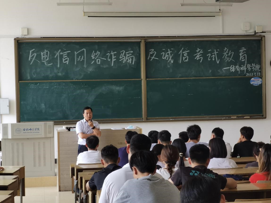本网讯 为加大反诈知识的宣传普及力度,切实加强大学生消费观和反诈安全教育,教育引导学生提高风险防范意识,5月31号中午,体育科学学院在博约楼101组织开展“营造诚信考风·谨防网络诈骗”主题教育。体育科学学院党委副书记王飞、各班辅导员和2021级各专业全体学生参加。