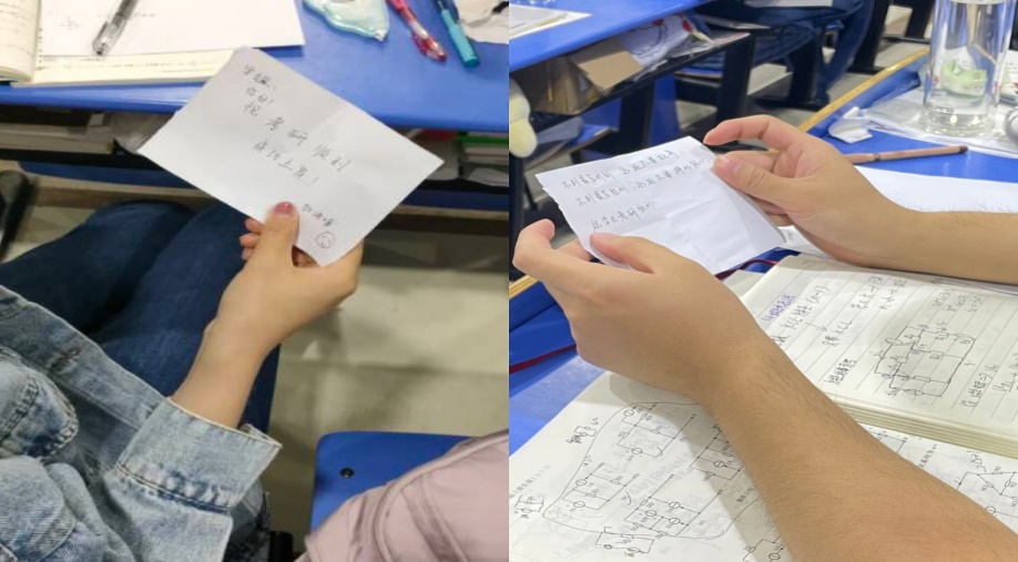 同学们为正在备战考研的学长学姐们写上祝福的话语,并亲自送到他们的手中。这项活动一方面帮助大家克服了和陌生人交流的恐惧心理,另一方面也为埋头苦学的学长学姐传递了温暖。