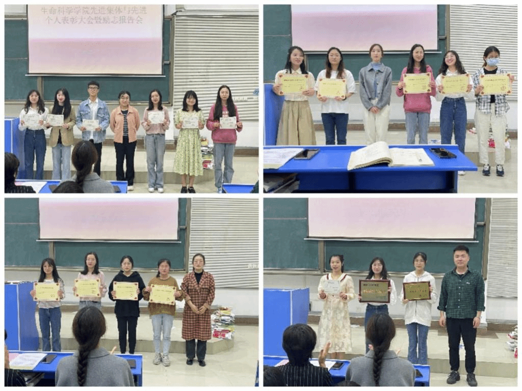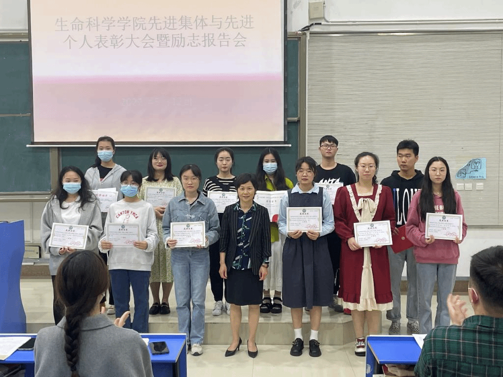 本网讯 为激发同学们创先争优意识,促进学院学风建设,5月12日中午,生命科学学院在锦绣校区逸夫楼西阶一教室举行先进个人和先进集体表彰大会暨优秀学生励志报告会。生命科学学院党委书记郭桃芬、辅导员高欢、杨帆、张瑜婷、梁悦,学生先进集体、先进个人代表和2021级全体学生参会。国家奖学金获得者张炀和卓凯丽、国家励志奖学金获得者吴琼三位优秀学生做励志报告。