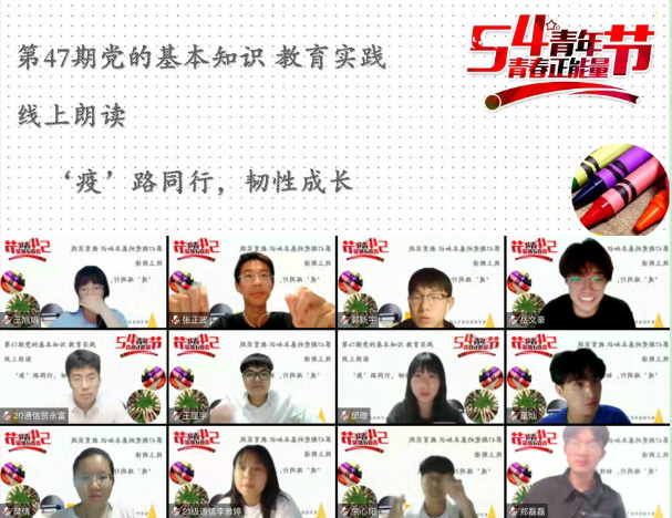 5月4日晚上,朗诵活动在线上准时进行。经过各班级推荐,共有32名选手以朗诵的形式向党和国家、亲人、志愿者表达赞美与感恩。选手们满怀激情,以饱满激昂的情绪将新时代青年的豪情壮志铺叙开来,感染着在线观看的同学们。