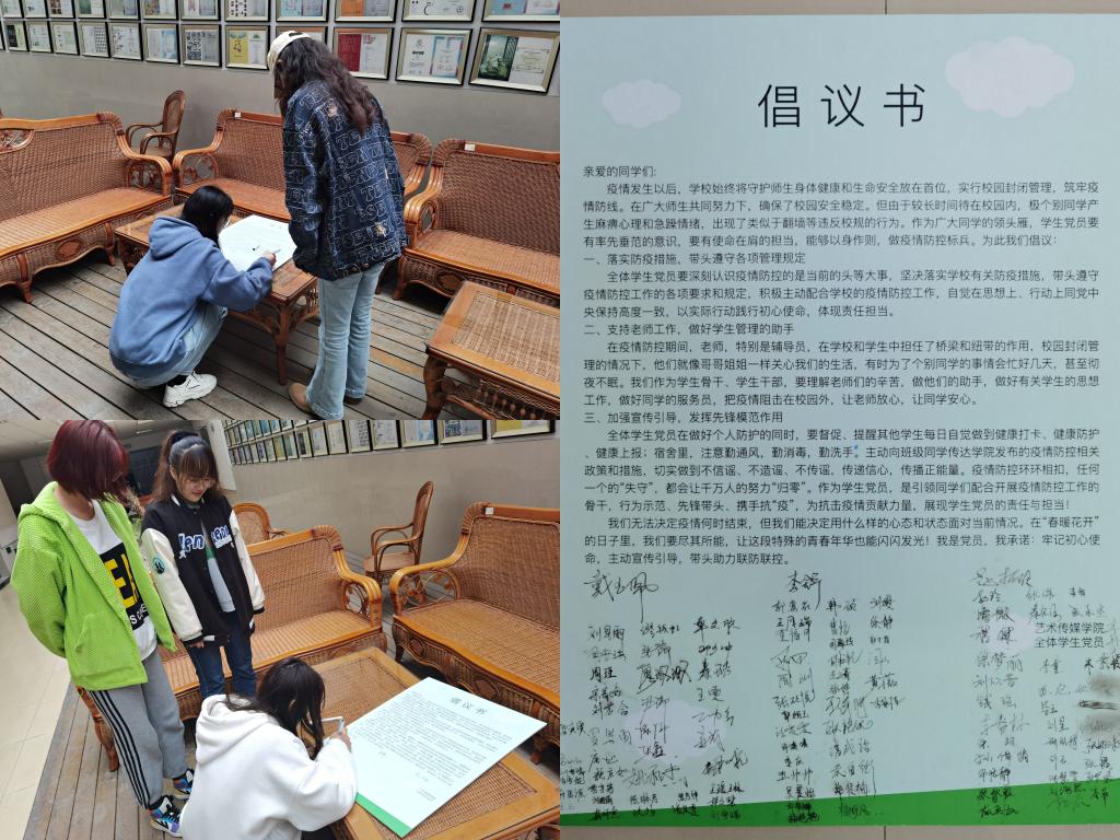 作为广大同学的领头雁,学生党员在关键时期发挥率先垂范作用,担当作为,做疫情防控标兵。4月2日他们发出《倡议书》,全体学生党员在《倡议书》上签字,表示要以身作则,带头遵守学校疫情防控的各项管理规定,做疫情防控的模范。