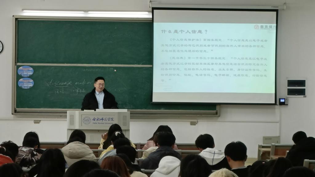 此次讲座是为了让同学们了解到当今社会目前金融状况,微商银行合肥三孝口支行葛思义经理从三个方面讲解了金融知识。第一部分给同学们普及金融方面的知识,比如:金融的内容、载体以及银行的业务范围,第二部分介绍了个人信息数据以及个人信息泄露的途径,葛经理以此为例,教导同学们需要保护个人数据和隐私。第三部分给同学们讲解个人资产管理和个人消费方式,还展示了当前常见的一些诈骗形式,最后介绍了同学们现在预防金融诈骗方法。