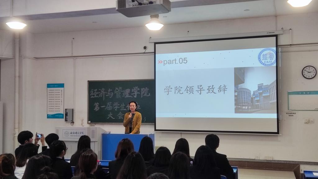 本网讯 11月3日,经济与管理学院第一次学生代表大会在锦绣校区逸夫楼109教室组织召开。经济与管理学院党委副书记陶敏老师应邀出席,分团委书记赵燕、学院各年级团干、普通学生共九十名齐聚一堂,共同谋划全院学生自身发展的大事。