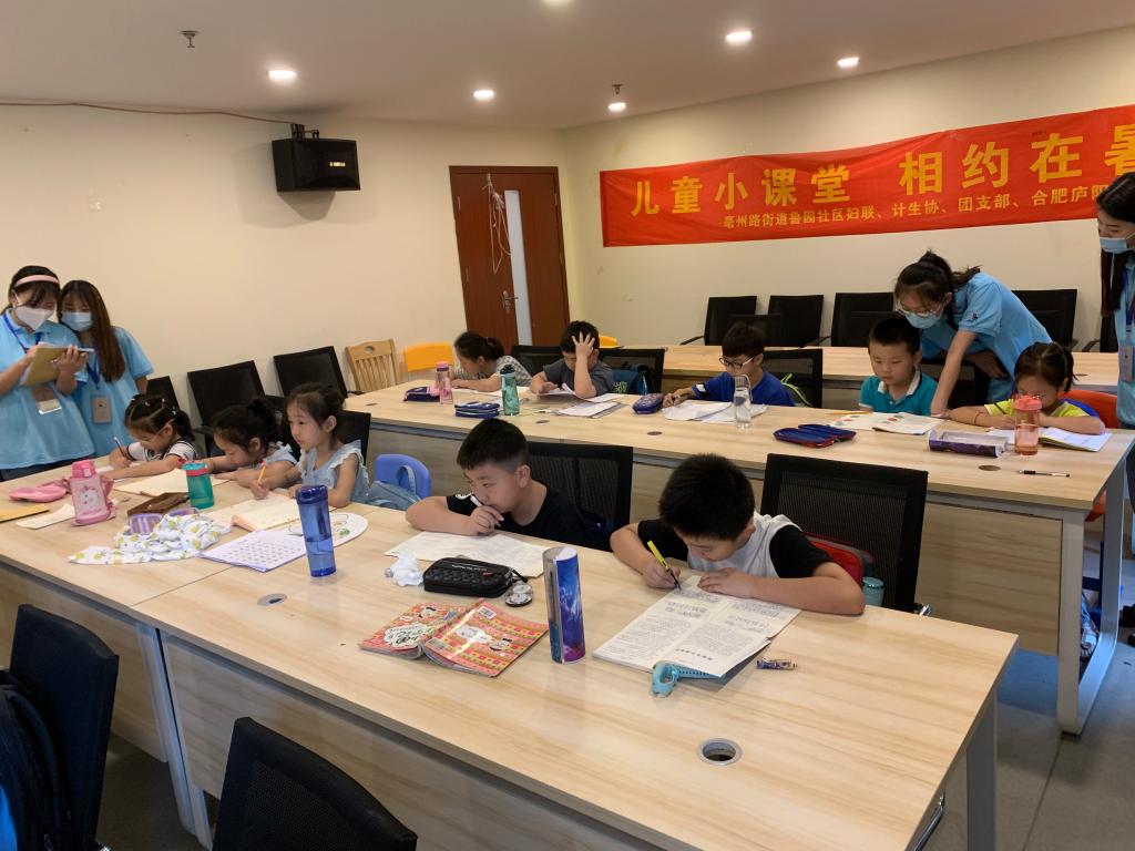 本网讯 7月29日上午,由我校经济与管理学院、马克思主义学院、外国语学院组成的8名志愿者们来到了安徽省合肥市庐阳区鲁园社区,并且携手社区主任一同开展了行知学堂开班仪式。由于台风“烟花”的影响,此次学堂推迟了3天,可谓称得上是好事多磨。这是我校经济与管理学院与鲁园社区的第三次合作,双方致力于为小学员们营造一个安静、充实的学习环境。