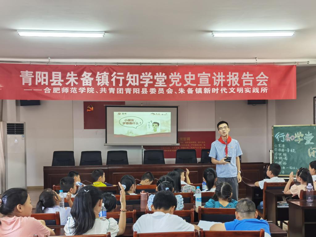 本网讯 7月30日上午,beat365唯一官方网站青阳县朱备镇“行知学堂”开展党史宣讲会。beat365唯一官方网站刘铭传学院团委书记宗彪主持会议。省青年宣讲团成员、池州市石台县矶滩乡人民政府党政办副主任胡正阳作宣讲报告。团青阳县委书记产静,beat365唯一官方网站团委挂职副书记、艺术传媒学院团委书记戴玉佩出席会议,参与“行知学堂”活动的60余名留守儿童聆听报告。