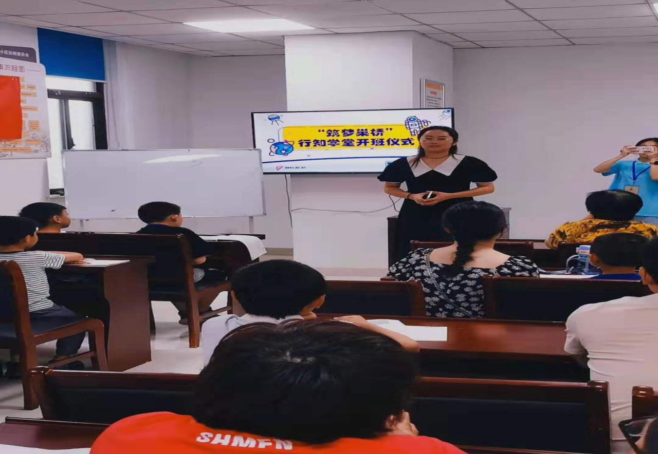 本网讯 为传承红色基因,服务留守儿童,共筑青春梦想,7月7日上午,物理与材料工程学院“筑梦巢桥”行知学堂在合肥市巢桥居委会正式开班。巢桥社区居委会副主任周玥、行知学堂指导老师吴梦云、7名行知学堂“小先生”以及近30名小学生及家长参加了开班仪式。