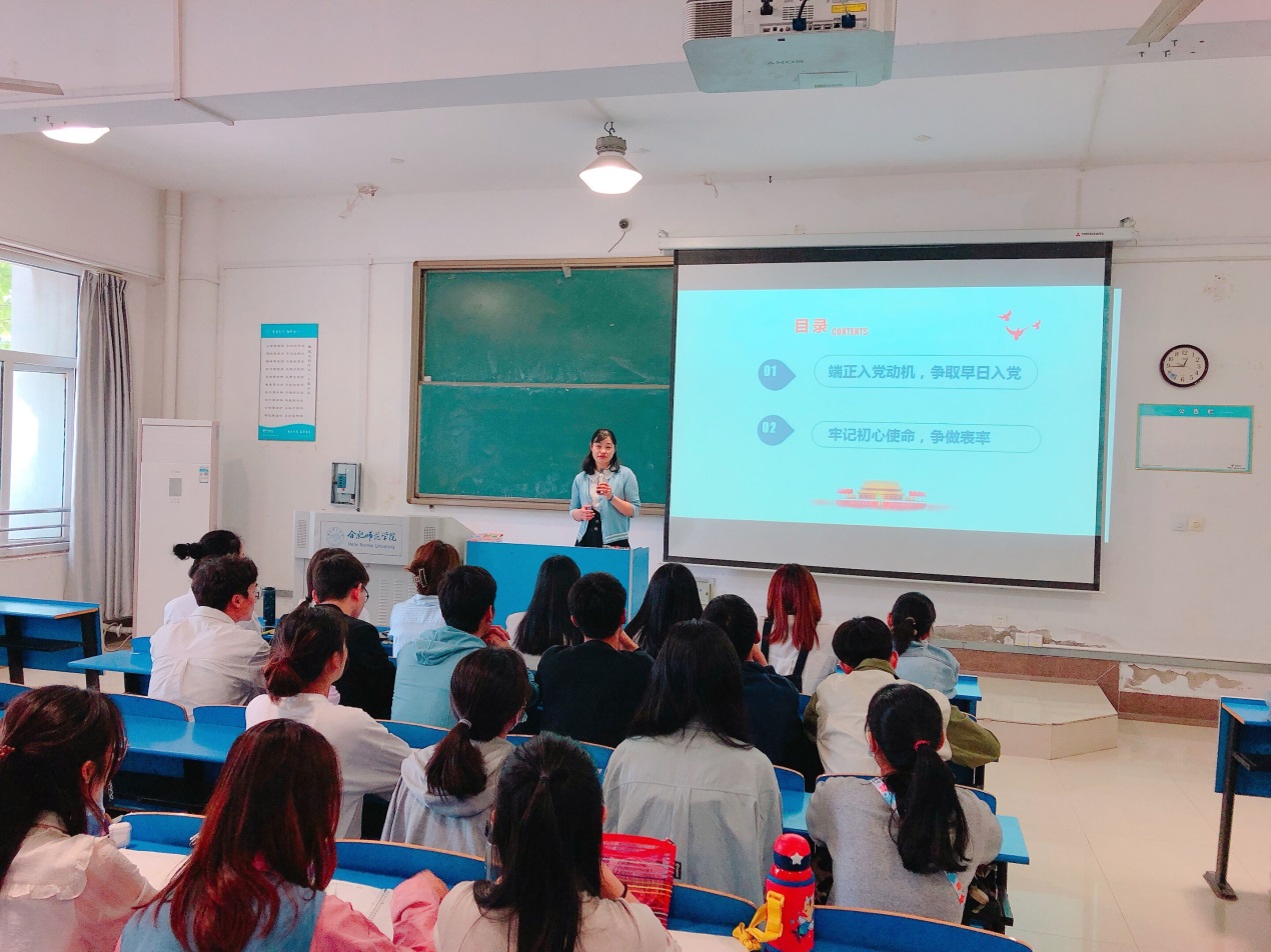 开班仪式后,穆娟以《端正入党动机,争取早日入党》为主题作了首场培训。课程分别从“什么是入党动机” “入党积极分子端正入党动机的意义是什么?” “什么是正确的入党动机”“如何在实践中不断端正入党动机”以及“牢记初心使命,争做新时代表率”等方面展开。她强调,同学们要自觉加强理论学习,坚持正确的政治方向,通过“实践—认识—再实践—再认识”,不断提高自身的思想认识水平,端正入党动机,争取早日入党,立志做党的光荣传统和优良作风的忠实传人。要坚持以习近平新时代中国特色社会主义思想为指导,把党校学习与党史学习教育、庆祝建党100周年纪念活动相结合,把党的历史学习好、总结好、传承好、发扬好,用理论指导实践,与学校学院同向同行,在新时代全面建设社会主义现代化国家新征程中奋勇争先、建功立业。