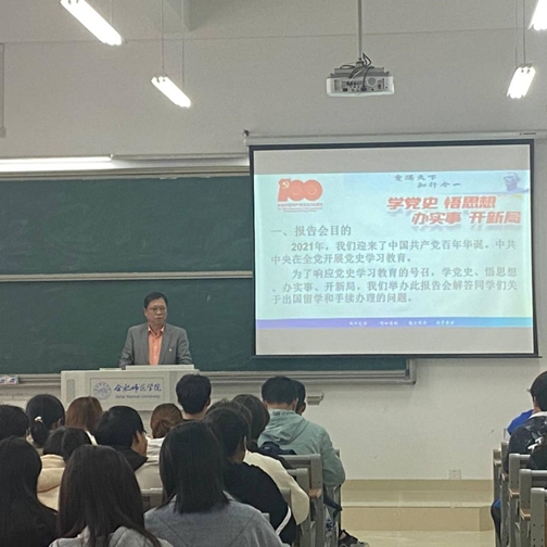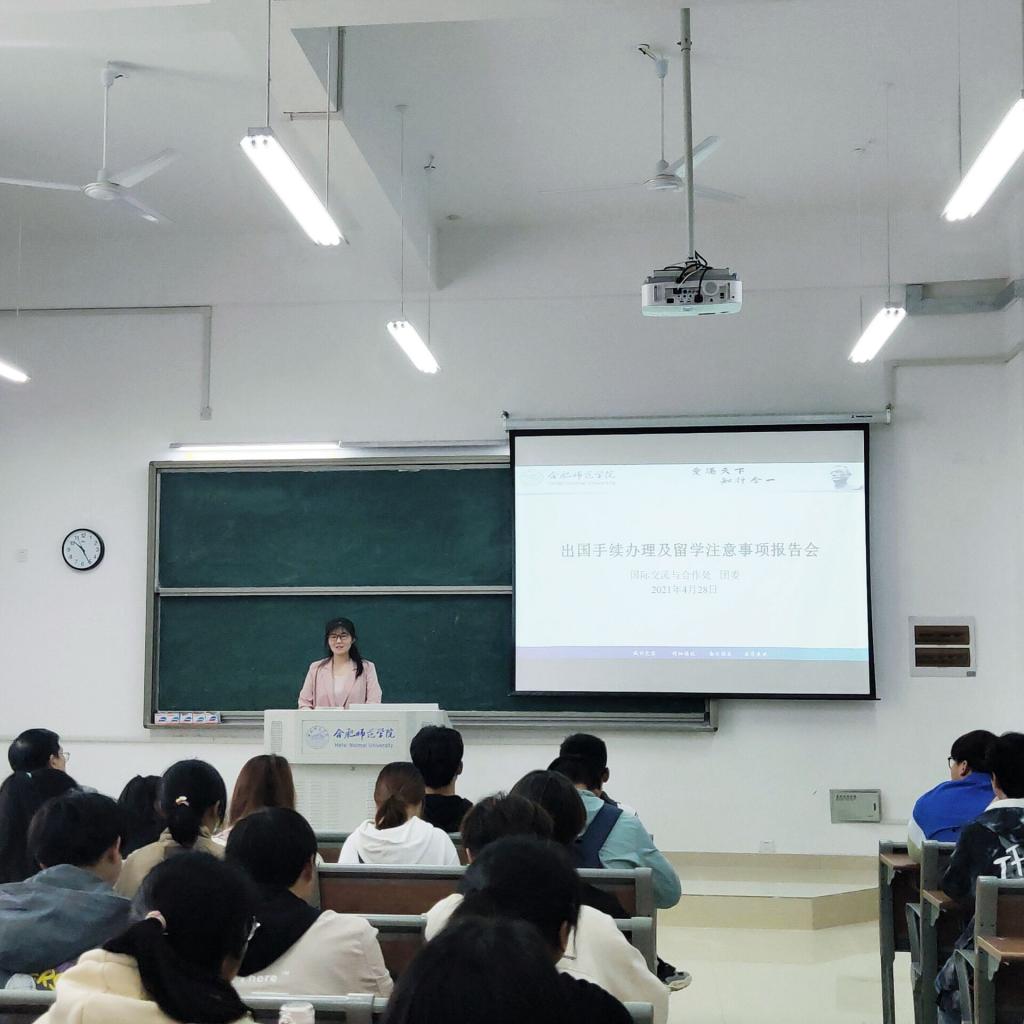 本网讯 为了深入贯彻落实学党史、悟思想、办实事、开新局的工作要求,把学习党史同总结经验、观照现实、推动工作结合起来,开展好“我为群众办实事”实践活动,国际交流与合作处从工作实际出发,了解、梳理学生关心的问题,于4月28日在滨湖校区A106和校团委举办了出国手续办理及留学注意事项报告会。来自不同专业的100余名学生参加了此次报告会。