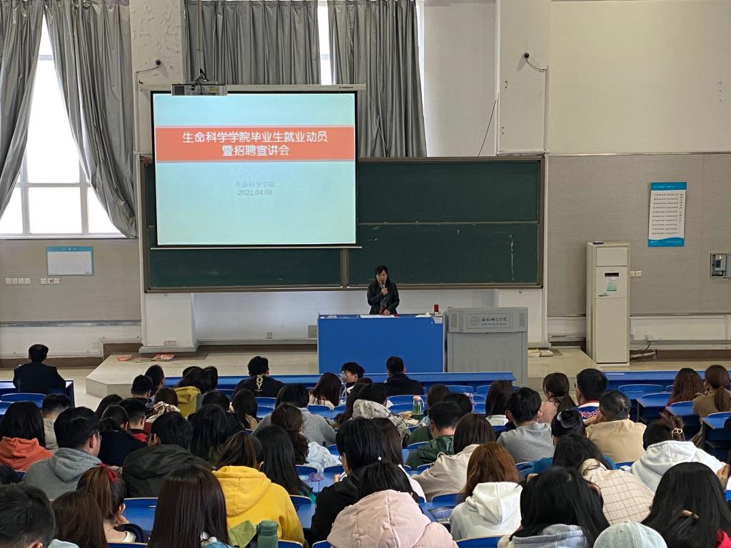 本网讯 为了让毕业生明析就业形势,服务毕业生就业,搭建毕业生与用人单位的双向选择平台。4月8日下午生命科学学院在逸夫楼西阶三举办了2021届毕业生就业动员暨招聘宣讲会。出席会议的有生科院党委书记郭桃芬、生物技术教研室主任陈金武以及2021届辅导员黄伟丽。2021届毕业生全部到场参加会议。