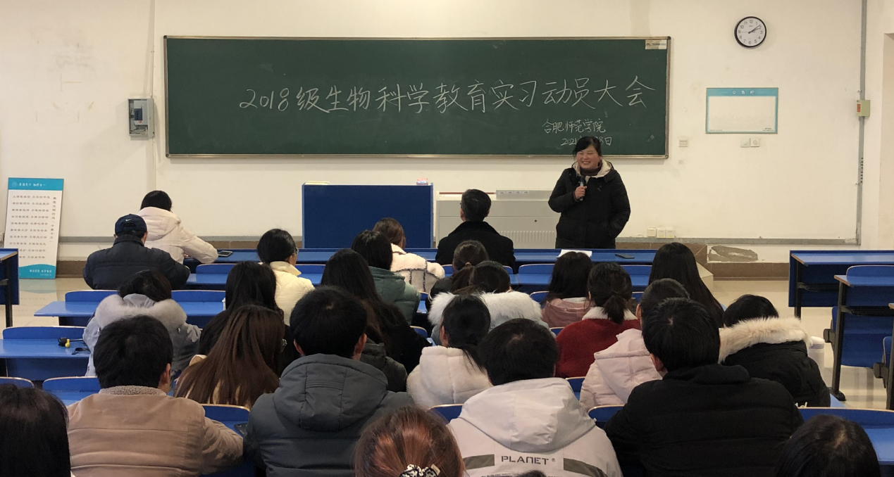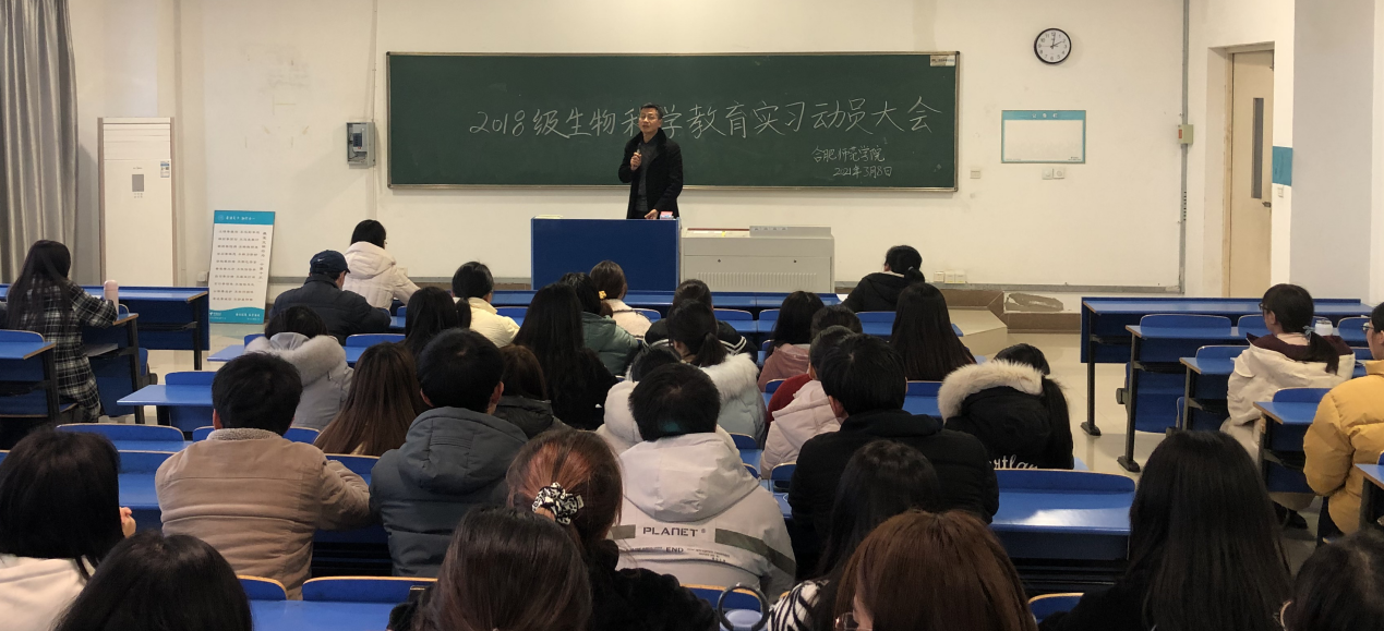 本网讯 为深入贯彻落实生物科学(师范)专业人才培养计划,提高人才培养质量,生命科学学院于3月8日在逸夫楼A302召开了2018级生物科学(师范)专业教育实习动员大会。院长徐忠东教授、副院长朱桂兰教授、教育实习指导老师、辅导员李万成以及2018级生科师范班全体学生参加了会议。会议由生物科学系主任孙娴主持。