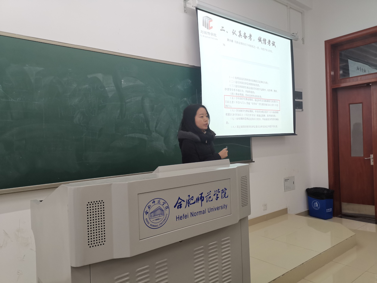 辅导员张玲俐也要求同学们认真复习,积极备考,向大家讲解了学生手册中关于考试挂科和考试作弊的不良影响和后果等相关内容。其中重点强调了学年制学生修业期间,通过补考方式及格课程累计八门以上者(不含八门)不授予学士学位等情况;考试作弊不仅该科成绩不及格,同样会受到学校的相应处分。
