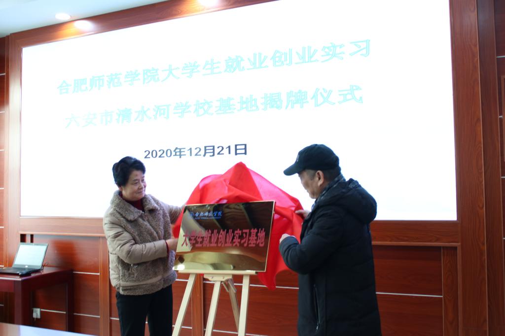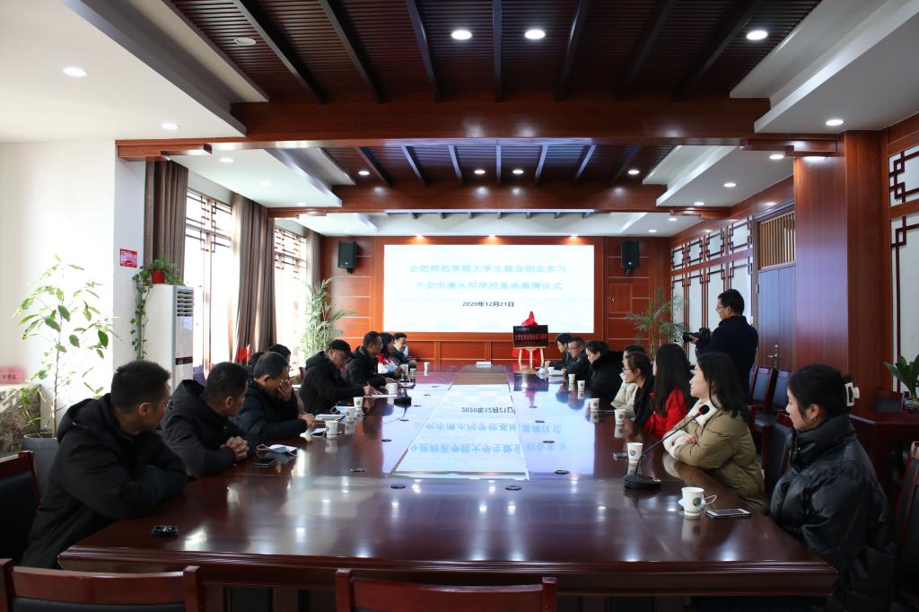 本网讯 12月21日,艺术传媒学院与六安市清水河学校共建大学生就业创业实习基地挂牌仪式成功举行,艺术传媒学院副院长余洋、清水河学校党委书记袁春玲、校长徐旭及我校部分校友参加了挂牌仪式,会议由校长徐旭主持。