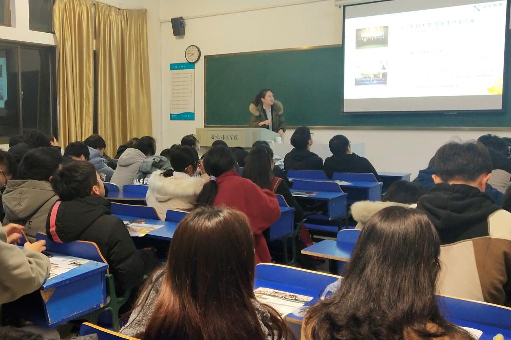 本网讯 11月26日晚,2020年寒假赴澳门名校跨国企业实习体验项目宣讲会在锦绣校区博约楼举行。本次宣讲会由香港高级讲师郑钰灵主讲,我校近100位同学到场聆听。