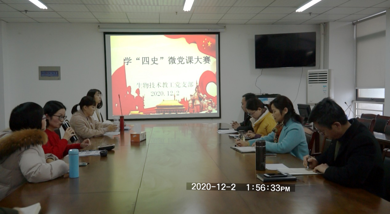 本网讯 为深入推进党史、新中国史、改革开放史、社会主义发展史“四史”学习教育,引导党员教师学好“四史”,坚守党的初心使命,更好的落实立德树人根本任务,在教学科研一线发挥先锋模范作用。12月2日下午,生命科学学院生物技术教工党支部于行知楼1502室开展了“四史”学习微党课比赛活动。活动由生物技术教工党支部书记陈金武主持,生命科学学院党委书记郭桃芬、院长徐忠东、生科系主任孙娴和陈金武四人担任评委,共有七名党员教师参加了比赛。生物技术教工党支部全体党员参加现场观摩。