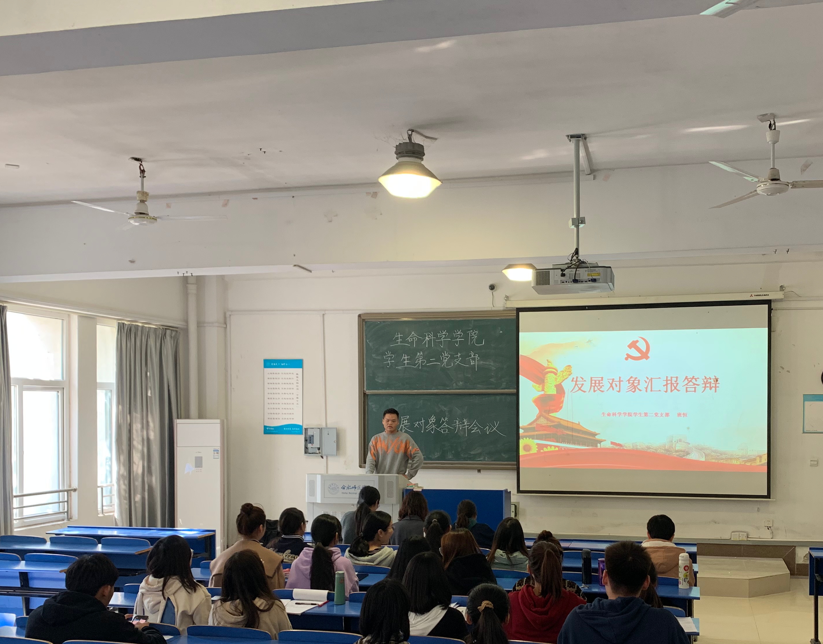 此次答辩会由各党支部书记主持,在宣布了会议流程及答辩要求后,各位答辩同学依次上台进行PPT展示。答辩同学分别从对党的认识、入党动机表明自己的入党愿望,简单介绍在培养考察期间个人在政治、思想、学习、工作、志愿服务等方面的主要表现,并且表达了今后的努力方向以及如何以实际行动争取入党。个人汇报环节结束后,与会领导老师紧紧围绕党的基本知识和时事政治对同学们进行提问,在一问一答的过程中,加深了同学们对于党的基本知识的了解和对党的深刻认识。