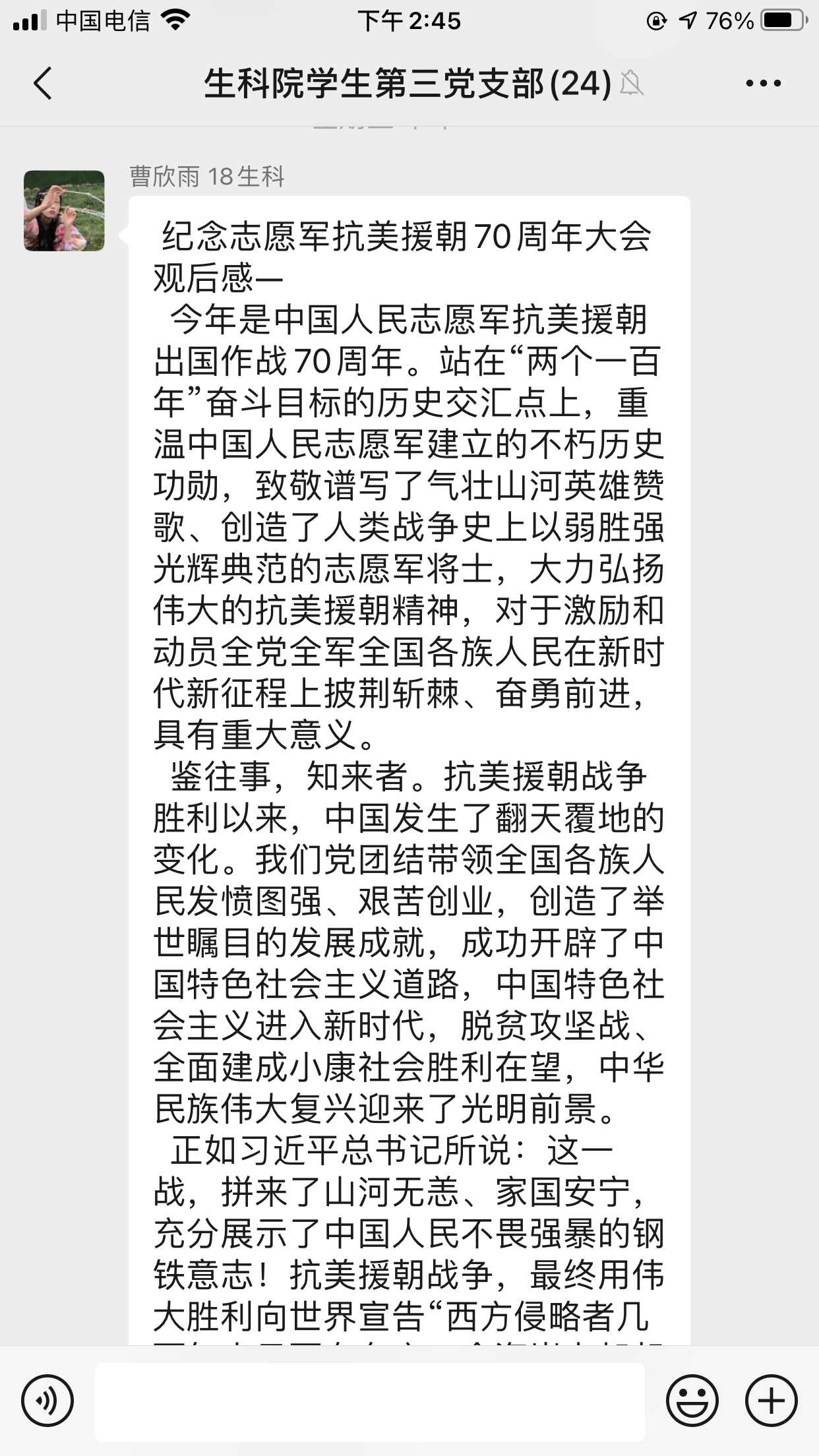 其他党员同学也都纷纷表示,一定要铭记抗美援朝战争的艰辛历程和伟大胜利,继承好、弘扬好伟大抗美援朝精神,不断砥砺民族风骨、汇聚民族力量、锻造民族血性、激发民族智慧,立足岗位,扎实工作和学习,为实现中华民族伟大复兴而努力奋斗。(生命科学学院:李万成)