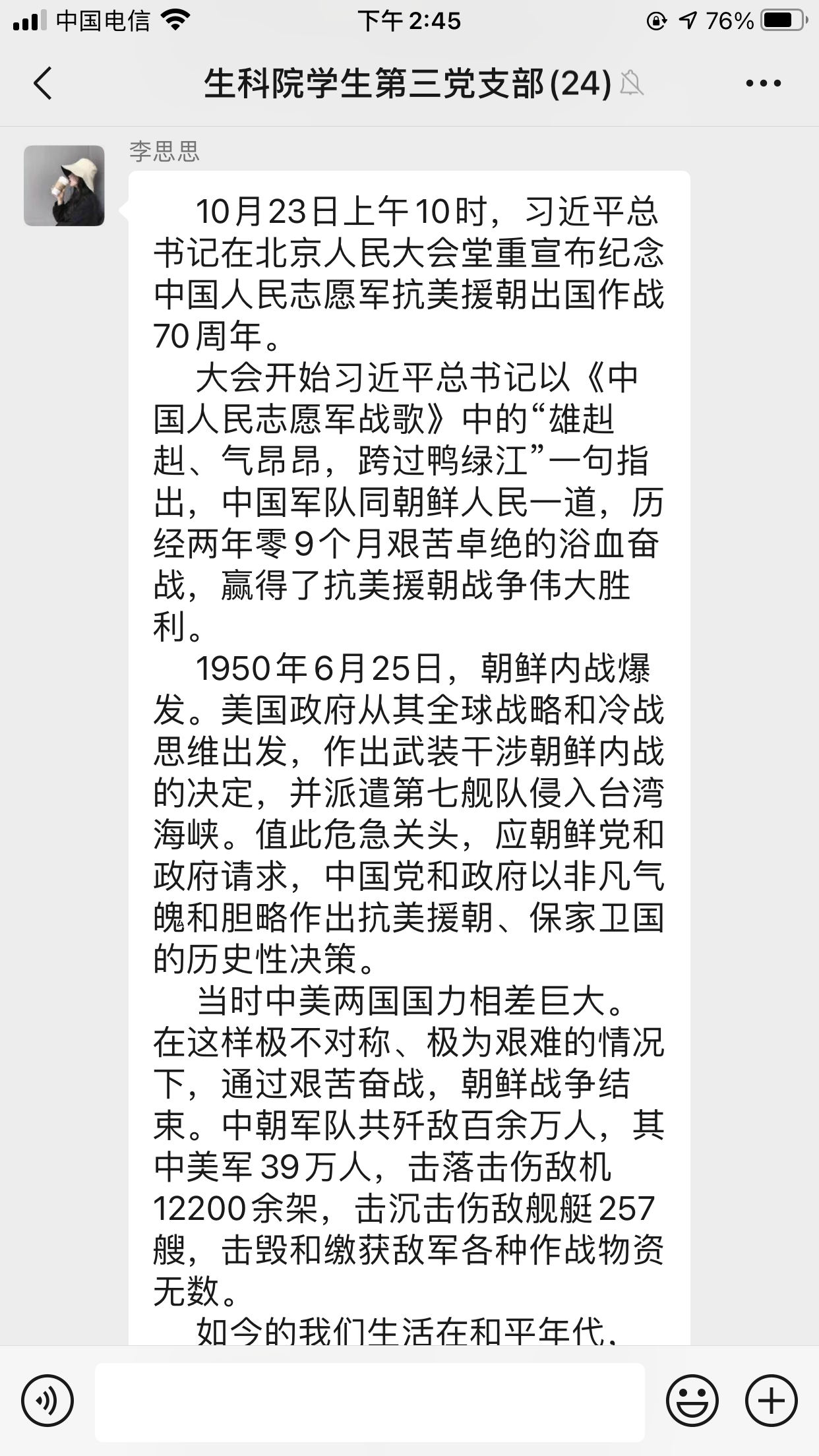 本网讯 10月23日上午,生命科学学院学生第三党支部全体党员通过电视、网络、学习强国等媒体平台,收看“纪念中国人民志愿军抗美援朝出国作战70周年大会”直播,认真学习习近平总书记在纪念中国人民志愿军抗美援朝出国作战70周年大会上的重要讲话精神。