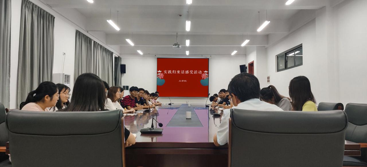 本网讯 为更好的了解学生暑期行知学堂开展情况,9月14日晚,在滨湖校区会议室组织召开文学院2020年暑期“三下乡”暨“行知学堂”实践活动总结座谈会,文学院党委书记李旺生、学生辅导员以及参与社会实践和行知学堂活动的同学代表参加了座谈会。