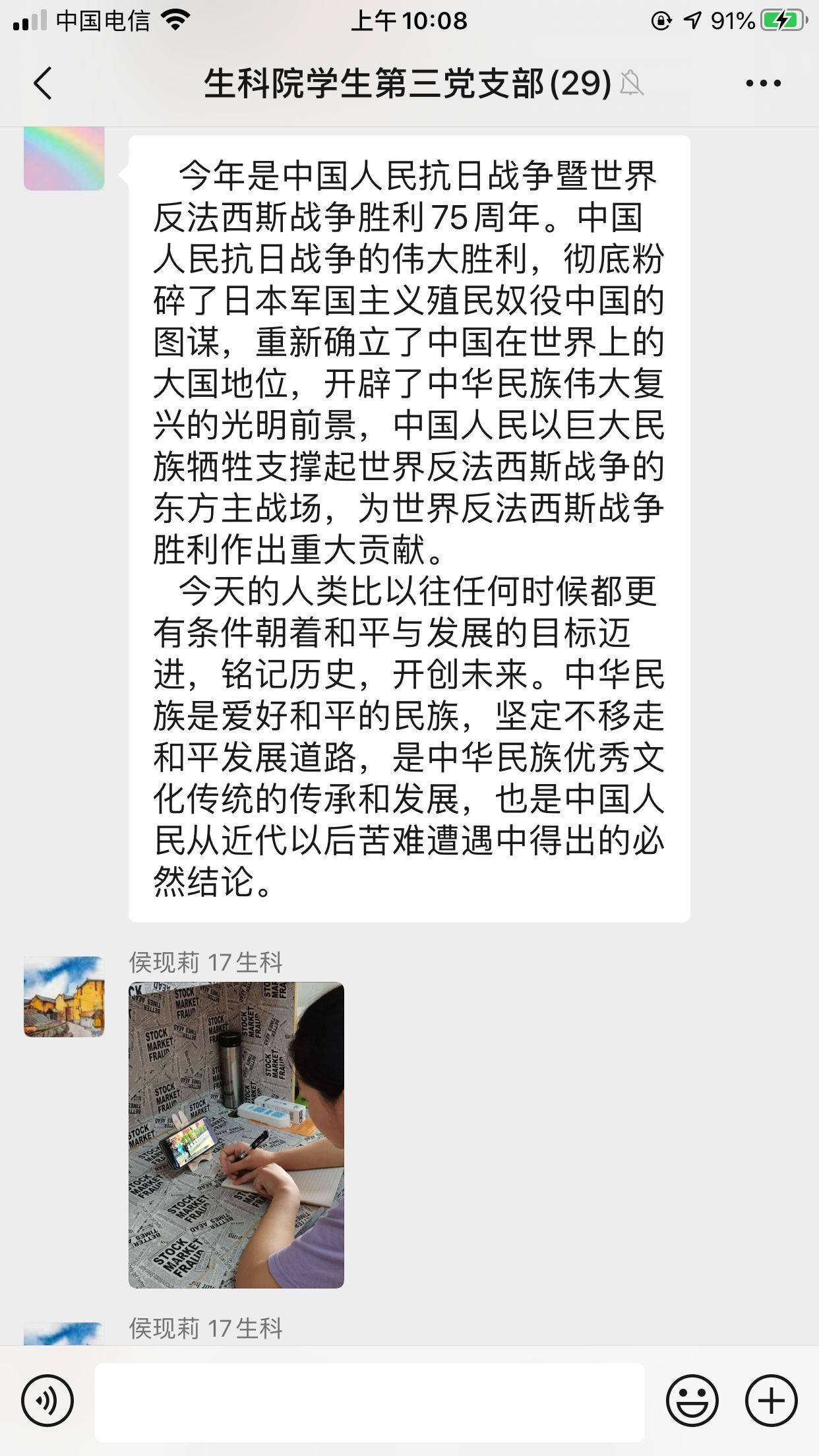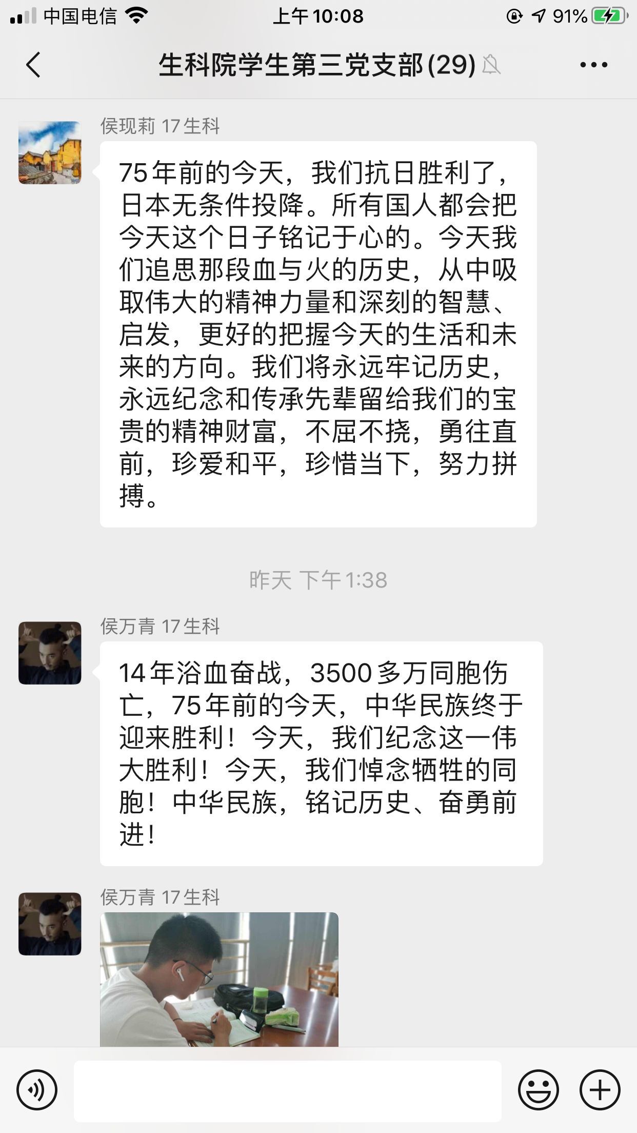 抗战胜利75周年,这不仅仅是纪念日,更是一段刻骨铭心的岁月,是中国人民强大精神力量的最好证明。山河无恙,致敬英雄。此次的学习,激发了支部党员的爱国情、强国志。他们表示,在今后的学习和工作中,将继续不忘初心、牢记使命,铭记历史、开创未来。(生命科学学院:李万成)